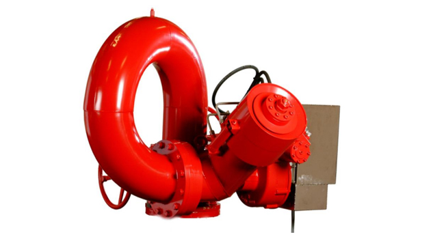 Single flow path long barrel water monitor with electric hydraulic remote control. Straight jet type water nozzle with jet deflector.